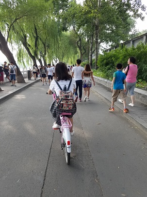 我选择了西安到北京西的Z20次列车,中途不经停任何站直接到北京,早上7点到北京。这一天下午游览了南锣古巷与什刹海。这里的京味比较浓,时常让我想起电影《老炮儿》里的场景。我们三个人各租了一辆自行车,骑车环海。