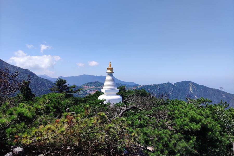 图中往左方向走有一个台阶到诺那活佛舍利塔,蓝天映衬下洁白的舍利塔格外显眼。