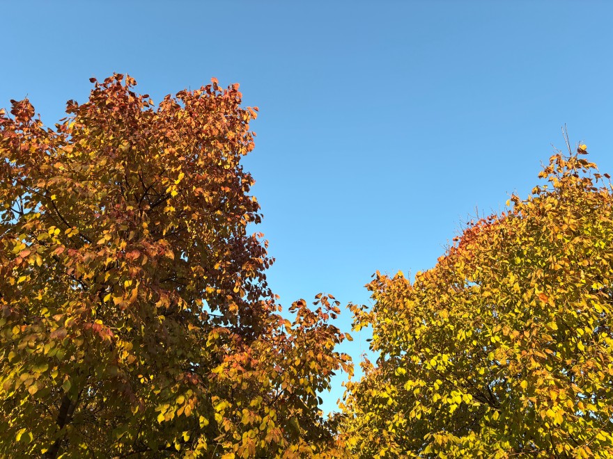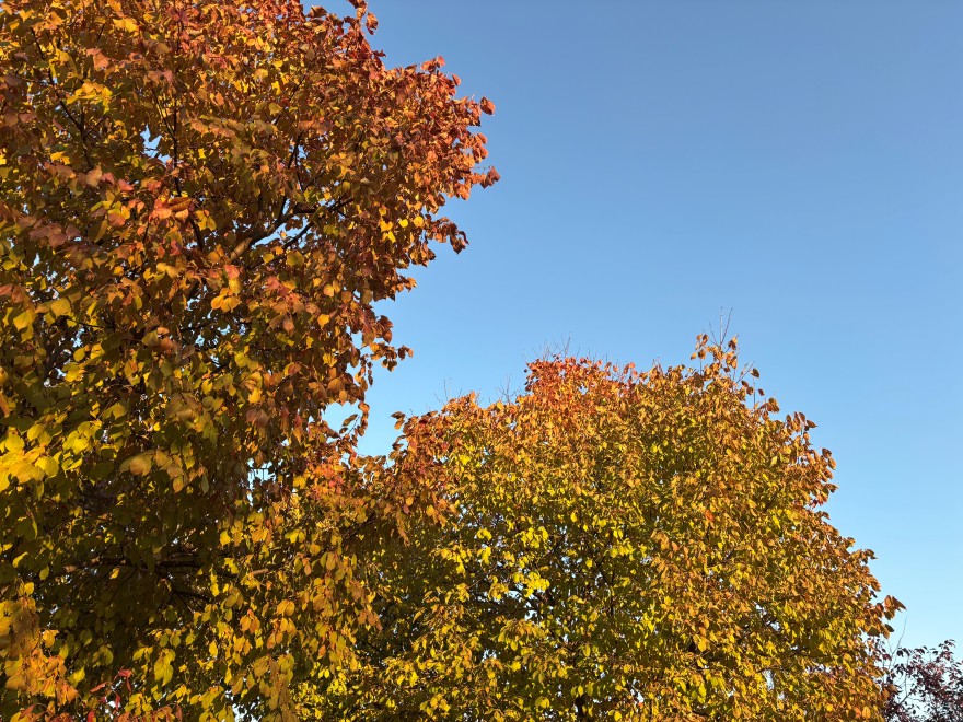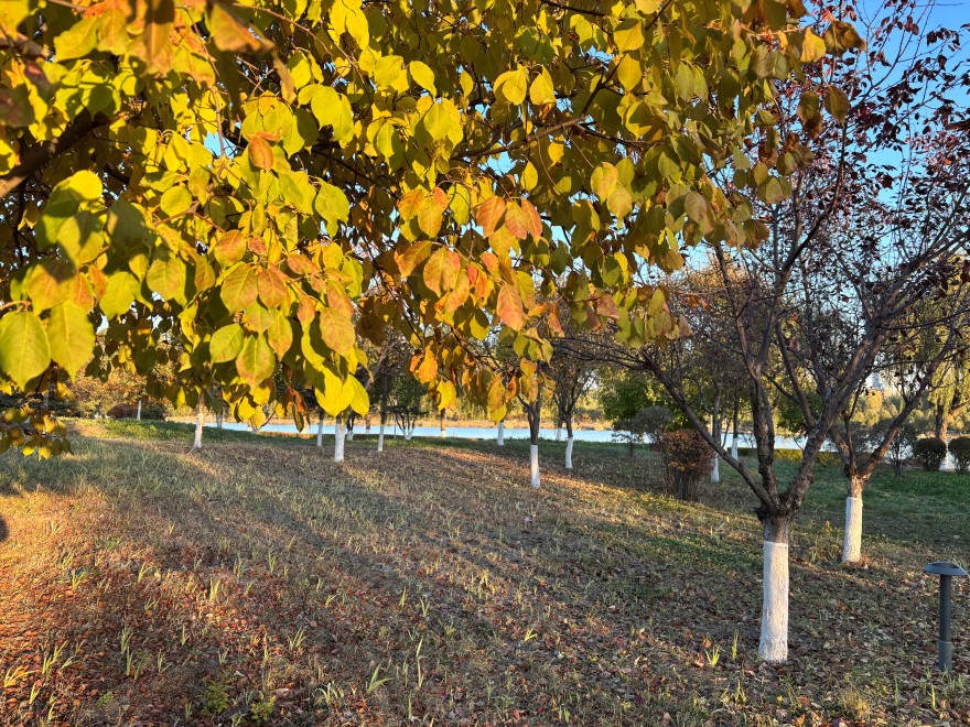 公园内的各式树木,晚秋时节已有部分叶子落地,树上的叶子正红得似火。