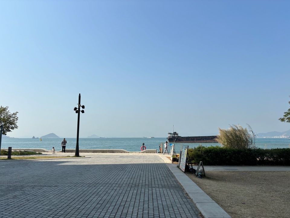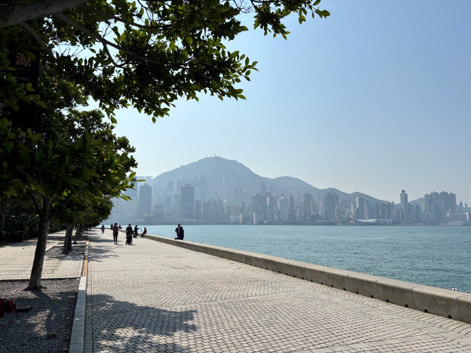 西九龙海滨长廊有很多市民和游客散步、游玩,冬季在这里散步能感受清新的空气与温暖的阳光,显得尤为珍贵。